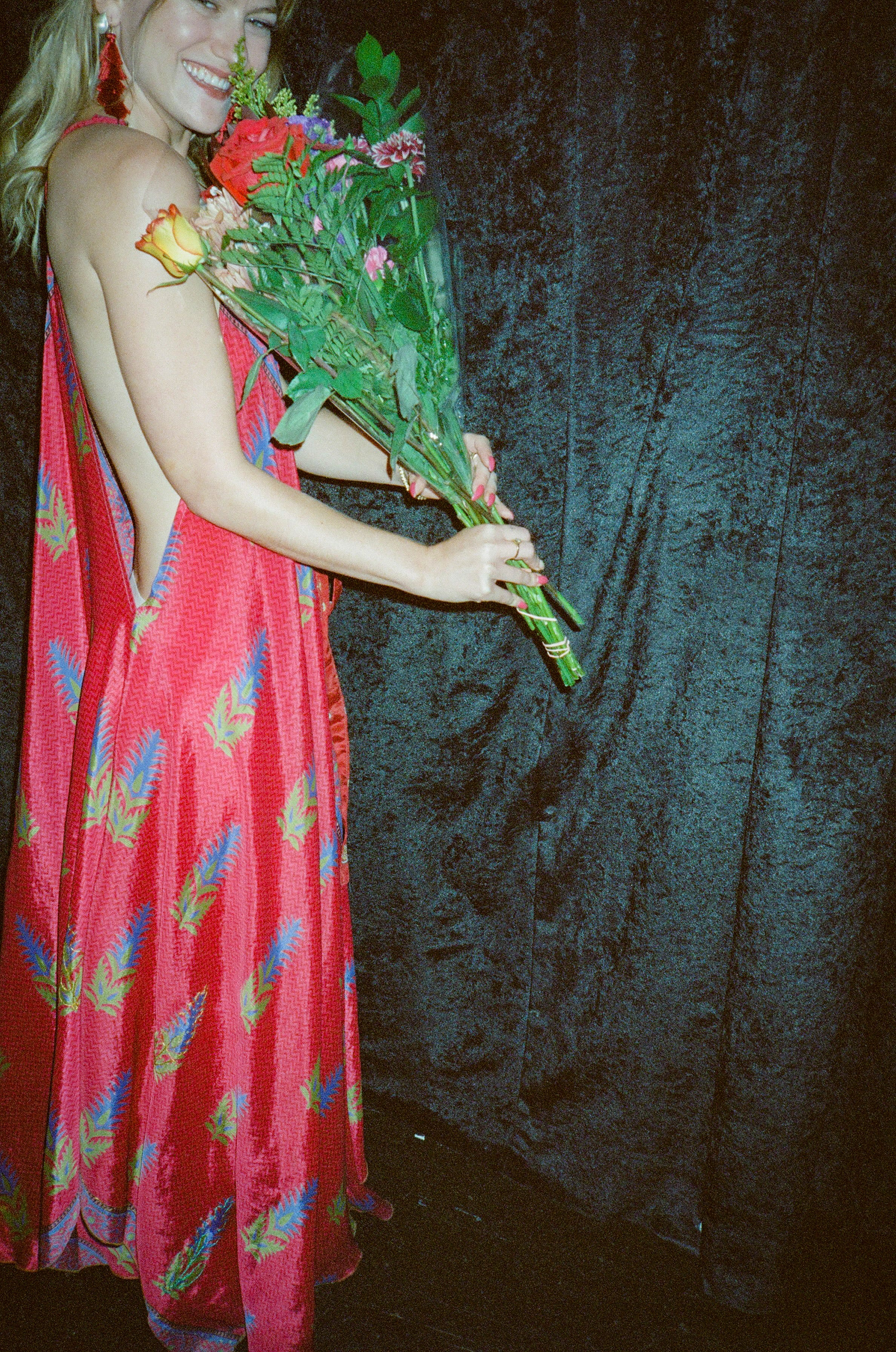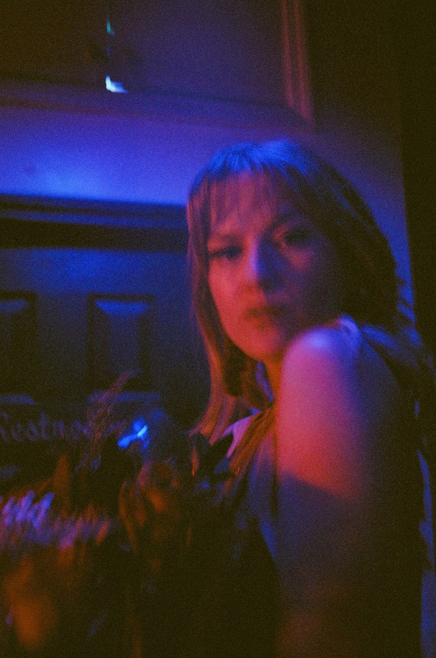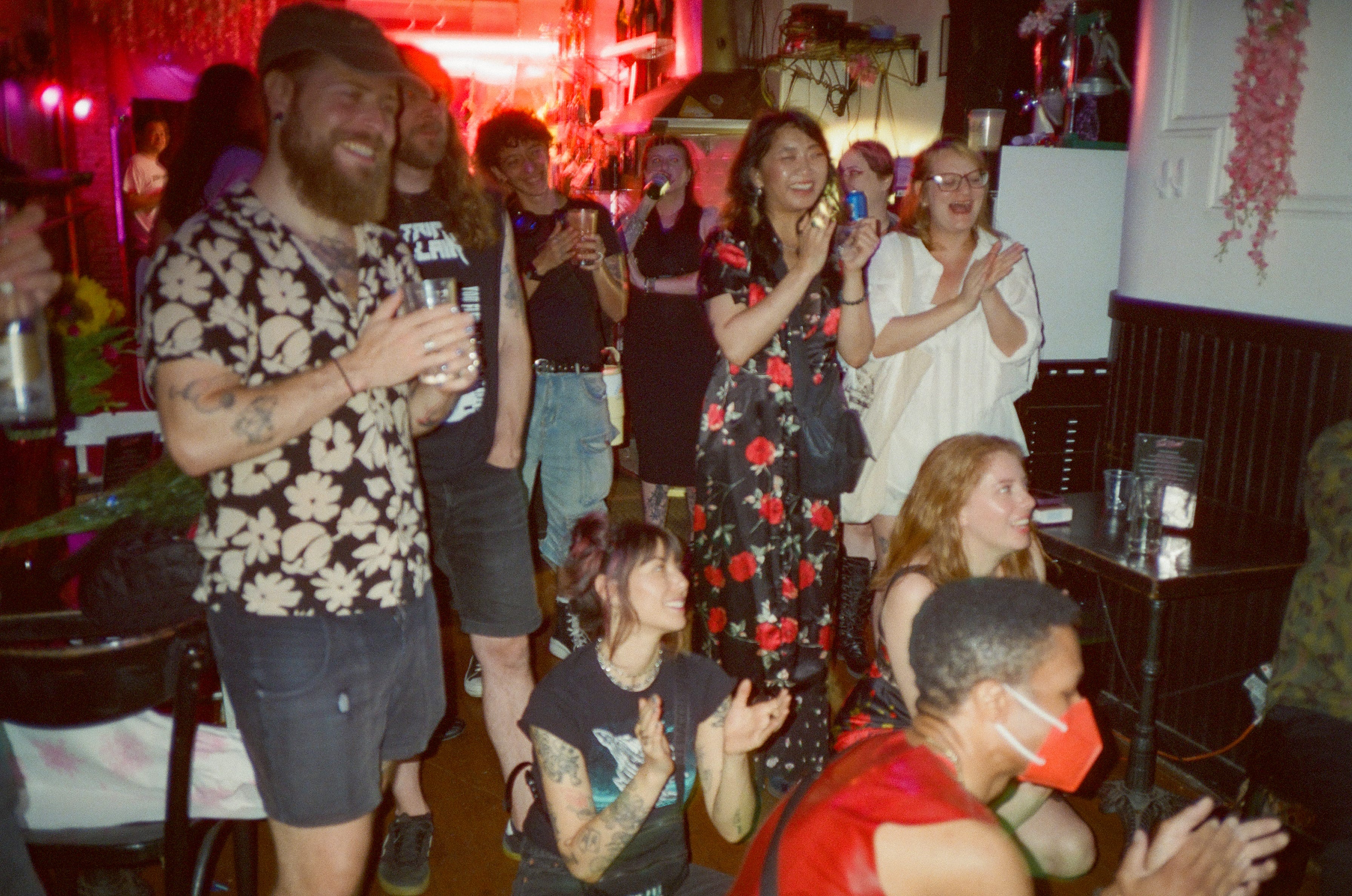 Nikki’s flushed as she comes up to me, embarrassed by the holdup. “I guess we could all gather around my computer.” She props her laptop on a barstool, and instinctively the crowd presses in. The glow from the screen casts a low, bluish halo on us, and suddenly the space feels less like a bar and more like a living room. Nikki grins, mischievously: “This actually makes way more sense since it’s the most intimate work I’ve ever done.”