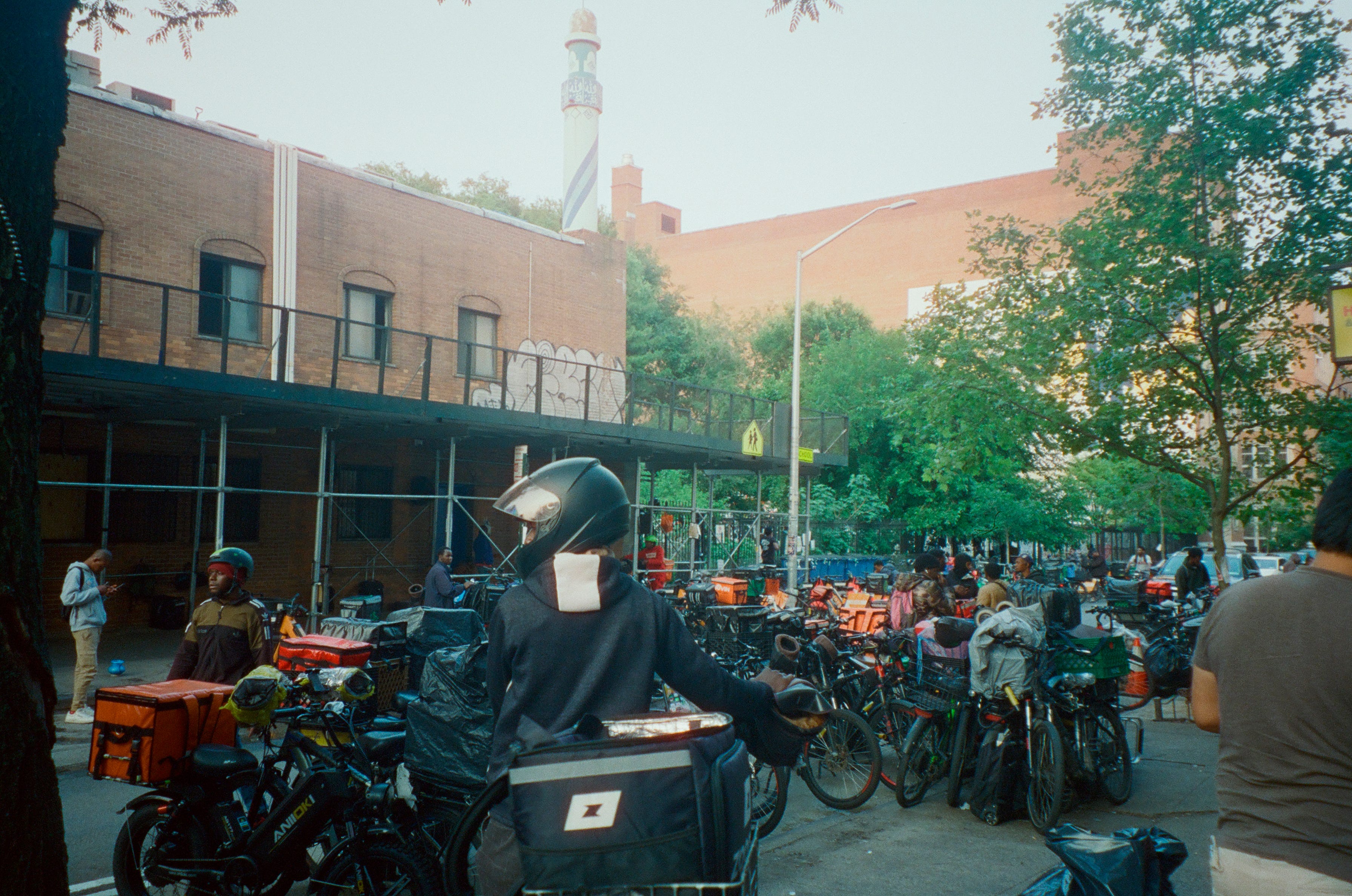 At any given hour, between 40 and 120 e-bikes and scooters line the curb, their Seamless and UberEats bags slung across the backs like motorcycle sponsorships. Across from this makeshift parking lot stands Madina Masjid, the East Village mosque where many of the workers come to pray. Next door, the East Side Community High School playground thumps with the high-pitched echoes of pickup basketball. Near the corner, a line of men in reflective vests spills out of an unassuming halal deli. Around lunchtime, small huddles of men convene outside, hunched over white foam clamshells filled with steaming rice and meat.