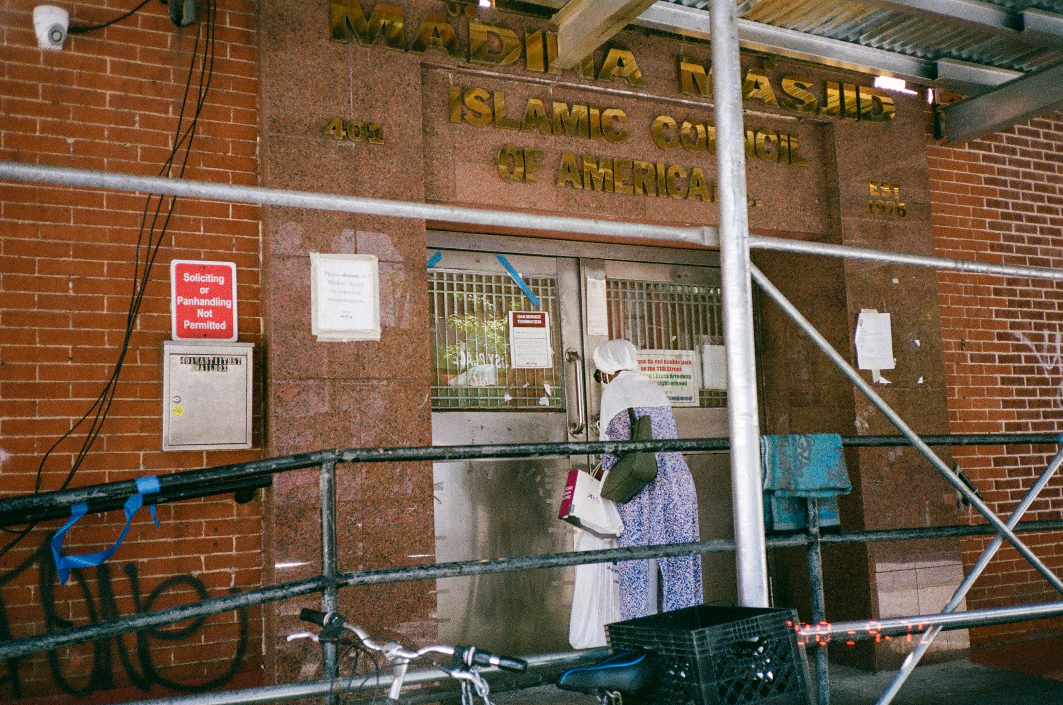 reported on the scene during two sweeps this summer, when dozens of these bikes were cut from poles with power tools, impounded, and taken to the 9th Precinct on 5th Street. During the first operation, on July 30, delivery workers’ personal items were discarded by police and Sanitation. On August 28, when the NYPD returned, locals quickly grabbed the deliveristas’ belongings, stashing them in the community garden before the seizures began.I’ve been fascinated by this block since moving to the neighborhood. Like so many streets in New York, within a few steps you’re transported across the globe. Walking past Avenue A toward 1st Avenue on 11th Street, you pass brunch mecca Westville, the high-intensity—or eerily empty—East Side Community High School, and then, suddenly, you’re somewhere else. Men crouched on flattened cardboard boxes angled northeast pray silently. There are always two jugs of water and a small wash basin for congregants to perform wudu, the ritual washing required before prayer. A woman sits on a folding metal chair beside a cooler of hot meals in takeaway containers. On weekends, the barbershop opens—which comprises of an office swivel chair, a pair of scissors, and a handheld electric razor.